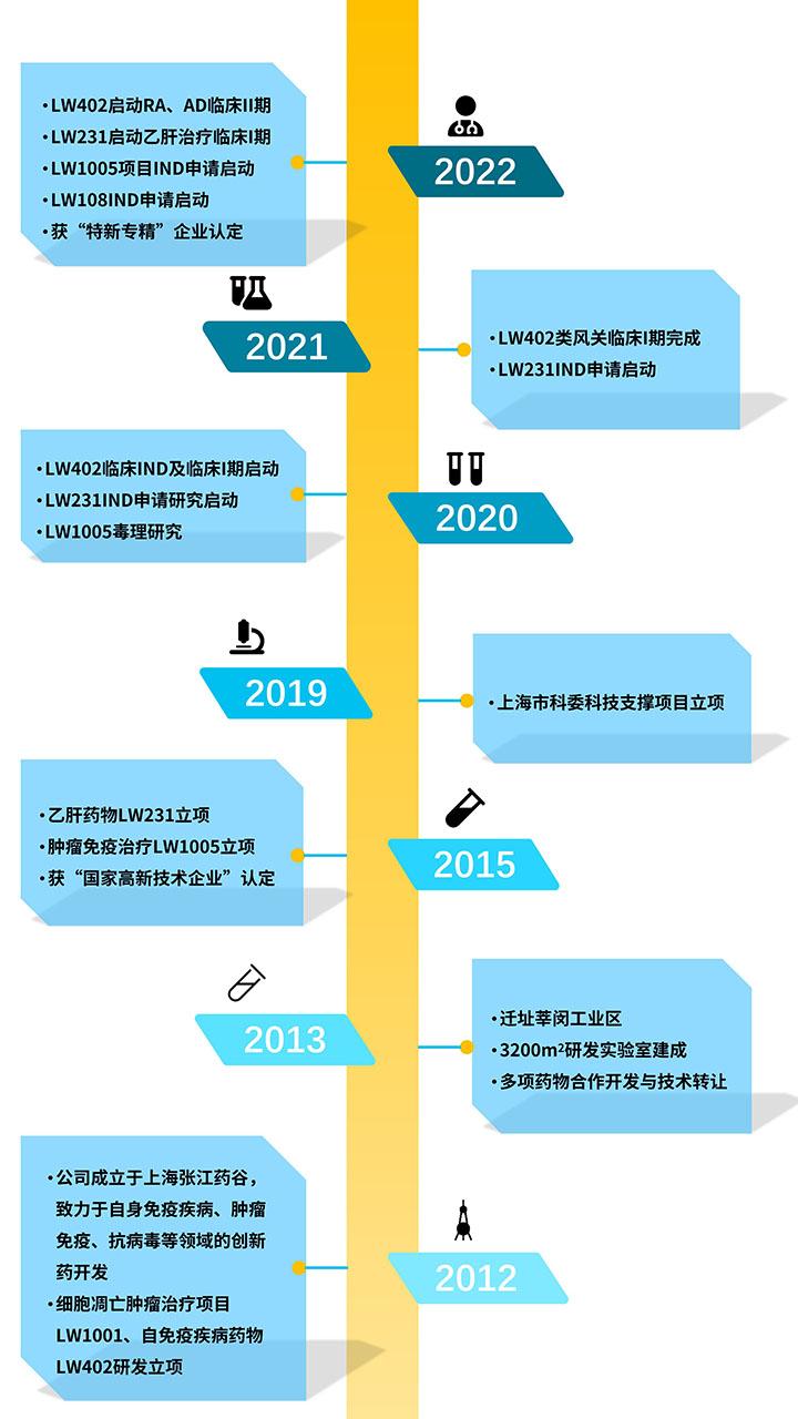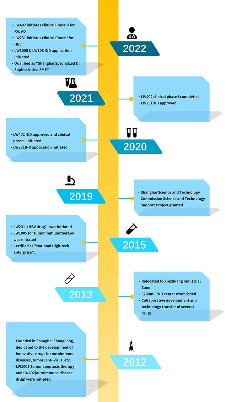 Since its establishment, Longwood Biopharma has carried out several self-developed small molecule innovative drug projects (FIC, first in class), which several products in clinical trials, two of them in clinical study phase 2. With world-class performance in clinical evaluation, our core product are expected to become major breakthroughs in related fields (BIC, best in class). It is expected that in the next three to five years, more self-developed projects will enter late-stage clinical studies while the company will move into a high-speed development stage of industrialization and commercialization.