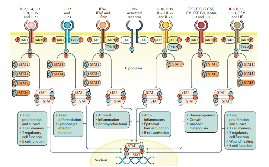 JAK(Janus Kinase) 激酶家族是近年来的热门靶点,类风湿性关节炎、白癜风、特应性皮炎等多种自免疾病都与JAK-STAT通路的异常激活有关,JAK抑制剂能够抑制JAK激酶,阻断JAK-STAT信号通路,具有巨大的治疗潜力。